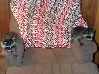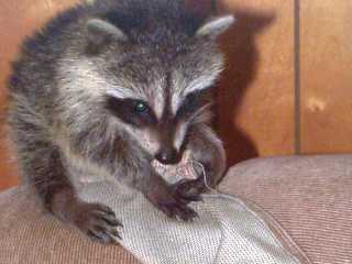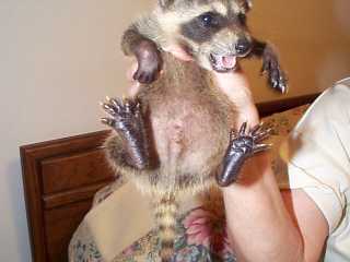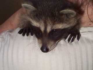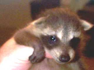 ![]() | A Quiet Moment - Not something we have often these days... Meet "Rocky", Not Rocky from the Bullwinkle Show a squirrel) and not the boxer either... Rocky The Raccoon. When his mother made a nest in an attic, the hole she was using got covered up which separated her from Rocky. When he got hungry, he started crawling around and fell into the wall. A 2' hole had to be made in the wall to extract him. 05/05/99 |