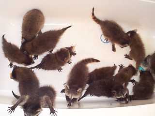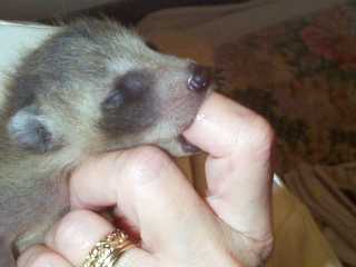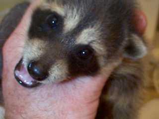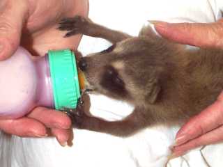 ![]() | This isn't near as good as my bottle !!- This little girl and her brother became orphans because someone believed all she had ever heard about Raccoons. The mother was seen out during daylight hours and assumed to be Rabid. She was trapped and destroyed. The next day, these two babies were found when they got hungry and started screaming. They are now 7-10 days old. PLEASE, don't mistake a mother raccoon out feeding for a dangerous animal. Now and through October, mother raccoons will come out right after sun up and just before sun down to feed. They do this so they can stay and protect the babies through the night. |