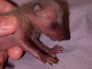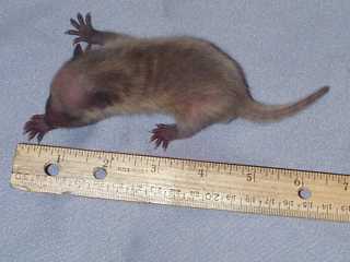 ![]() | Just washed my hair and now I can't find it !!- They weigh in at a whopping 85 grams. Their hair is so thin that the rings on the tails are just barely visible. The usual face mask isn't visible yet either. The umbilical cords have just fallen off and we estimate them to be 3-5 days old. | ![]() | Hey, give me some air here..- Now 9 days older, these babies are starting to get more hair on their heads and back. Bellies, inside of legs, and top of feet still have no fur. Ears have no fur and still lay flat against her head. OBTW, she's not being choked here. She's screaming for more bottle.... |