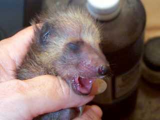 ![]() | Well, do I measure up ?- This little girl and her brother are the youngest babies we've ever received. Their mother made a nest in a drain pipe. With the recent heavy rain fall, the litter of four were washed into a street drain. These two were able to hold on to sticks and twigs till they were rescued by a lady with a big heart. |