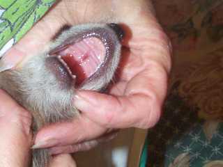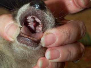 ![]() | It hurts so bad !!- Here is our latest arrival... She has a tear in her eye for a good reason. As a result of her fall from the Litter Den, She has a split palate and can't nurse a bottle till it heals. This is just another of the challenges we face when trying to help these babies. 07/31/99 |