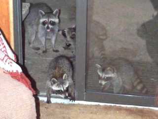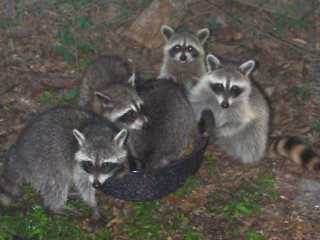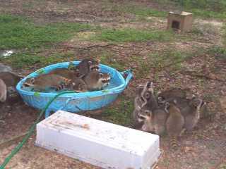 ![]() | Look Mom and Pop, I got babies!!- We love it when raccoons we've released return home for a visit, and a treat of course, and bring with them a healthy litter of babies. This is one of our last years releases and this is their first visit... 07/30/99 |