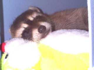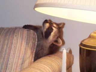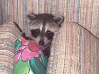 ![]() | They stole my tail !!! We knew those bandits were guilty of something. Trouble is, we can't find the evidence.. Bobbie is a natural Bobbed Tailed raccoon. We had a Bobbie last year but her tail had been bitten off. This one was born without one. 06/19/99 |