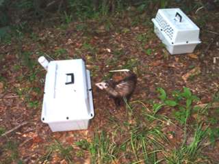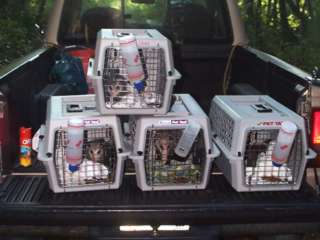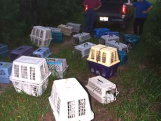![]() | Pet Carriers and Possum Pods as far as the eye can see! - Transportation to the release site can get quite difficult when you have 42 to release. It takes all the carriers we can find to pull it of this season. July 22,2001 |