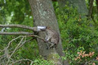 If I didn't have this jar on my head, I'd bite you !! - We watched as she tried desperately to remove the jar. Finally, she came down the tree and I was able to capture her. Even with a jar on her head, as you can see by cuts on my arm, she was still quite a hand full. I was able to remove the jar and she wasted no time putting as much distance between us as she could. 11 April, 2002 |