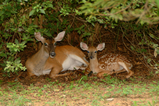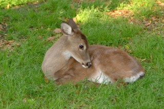 Ahhhh! Nothing like a nap in the shade. - But now Pebbles has a little friend. Though Pebbles is now a year old, she did not have a fawn this season. This little fawn is another orphan that is in our care. Though Pebble's won't let it nurse, she does let him hang out with her.