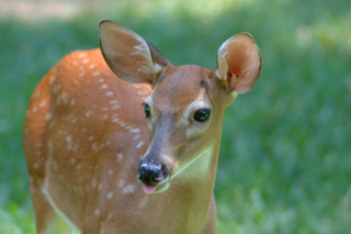 Here's a rasberry for you! - This season, Pebbles has twins. This is the little buck and the other is a doe. They have distinctive color markings around their eyes and it looks almost like eye makeup.