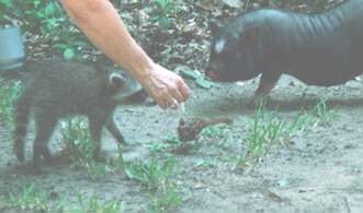 Yes, Dixie even raises birds. Here she's feeding a Brown Thrush she raised while Peggy and Nanny look on and wait for their treat.