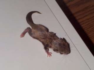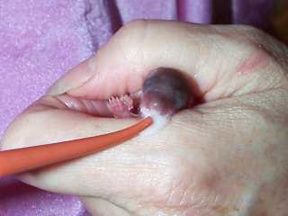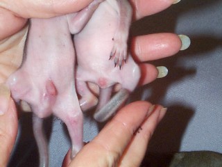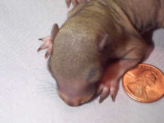 | 5 weeks - entire body dark, charcoal gray, head covered with fur and tail beginning to fill out. - approx. 1- 1 ½ cc per feeding. |  |