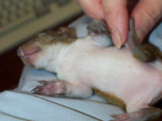NOTE: A healthy baby squirrel, while in the hairless state, is bright pink all over, with pink gums and lips; it squirms, responds to touch, feels warm, and is fat and round. A dehydrated or cold baby is grayish pink with grayish gums and lips; it will ball up, be unresponsive, sluggish or lie still; it will look thin and feel cold to your touch. A healthy furred baby will have very pink gums, respond appropriately to its environment, feel warm, and look round and full.